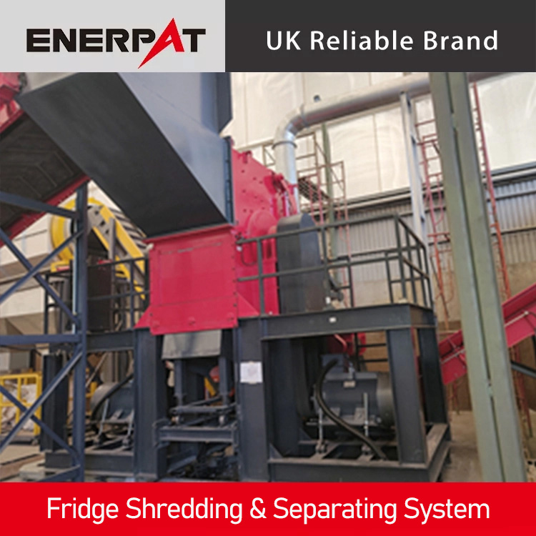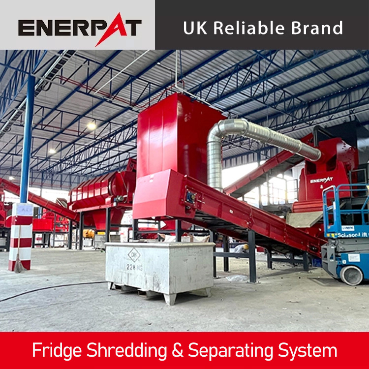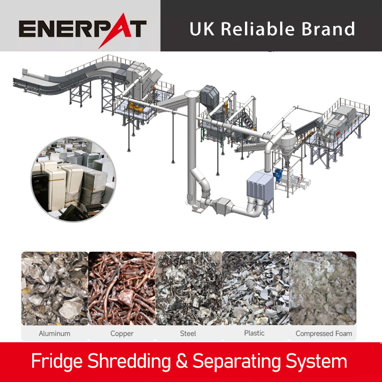 ENERPAT 冷蔵庫の細断および分離ラインは、安全性、高スループット、環境に優しい操作を融合したモジュール式セットアップを使用しています。有害なガスを捕集するために、各ユニットはまず手作業で分解されます。次に、シェルは一次シュレッダーに入り、粗いサイズに縮小されます。磁気選別機は、純度 98% 以上の鉄を取り除きます。続いて渦電流分離器が使用され、95% 以上の効率で銅とアルミニウムが回収されます。次に、静電選別機がプラスチックを選別します。閉じた泡と集塵ループによりプラントを清潔に保ち、全体の純度を 97% 以上に高めます。このシステムは 1 時間あたり 100 ~ 120 台の冷蔵庫を処理し、ENERPAT を冷蔵庫リサイクルの最前線に保ち続けます。