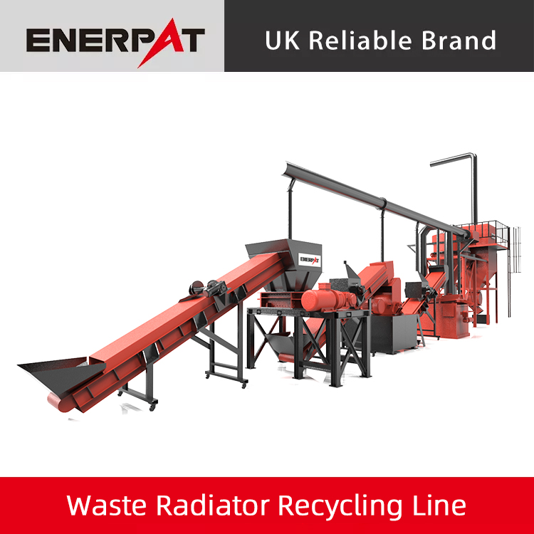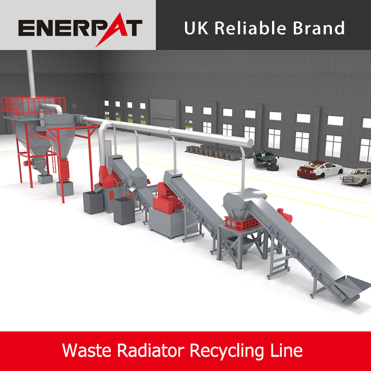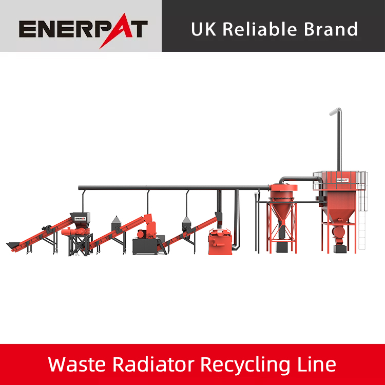 Enerpat の廃ラジエーター リサイクル ラインはモジュール式レイアウトを採用しています。このラインには、チェーンコンベア、二軸シュレッダー、ハンマーミル、磁気選別機、空気選別機、パルス集塵システムが含まれます。すべてのユニットは密閉され、集塵装置が装備されているため、リサイクルプロセス全体をクリーンで汚染のない状態に保ちます。