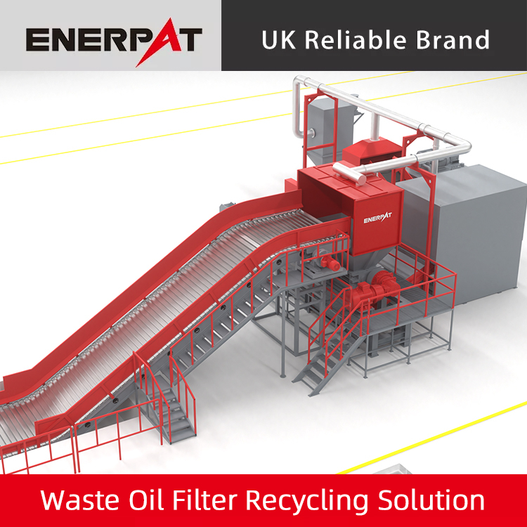 Enerpat 廃油フィルターリサイクルラインは、オイルフィルターを 30 ~ 60 mm のチップに粉砕する 2 軸または 4 軸シュレッダーから始まります。振動スクリーンは残留油を排出しながらチップを次のステージに均等に広げます。磁気選別機が紙からスチールを引き抜きます。次に、鋼はハンマーミルに入り、小さなペレットに形成され、その後洗浄および乾燥されて、清潔で乾燥した金属が製造されます。油を染み込ませた紙は、油を除去する工程を経て、乾燥した紙として出てきます。