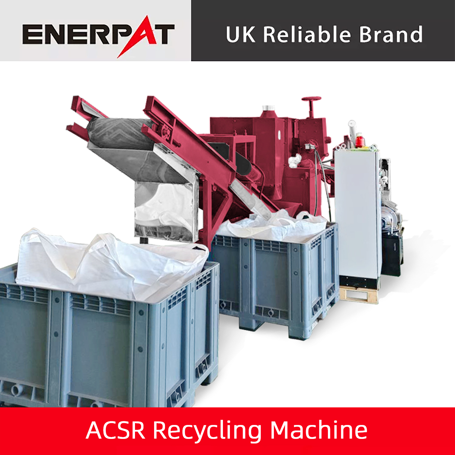 ENERPAT ACSR 破砕および選別ラインはモジュール式レイアウトに従っています。丸型ホッパー、自動供給装置、シュレッダー、集塵装置、磁選機が含まれます。密閉された防塵設定により、リサイクル作業全体がクリーンで汚染のない状態に保たれます。